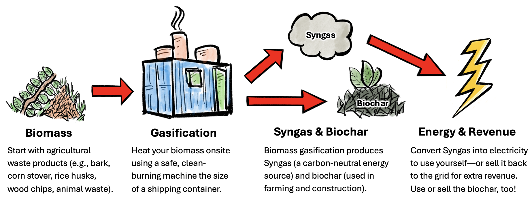Ultimately, the process converts biomass into a carbon-negative energy source (even better than carbon neutral), which you can use or sell. You can also sell the biochar—a byproduct of biomass gasification.